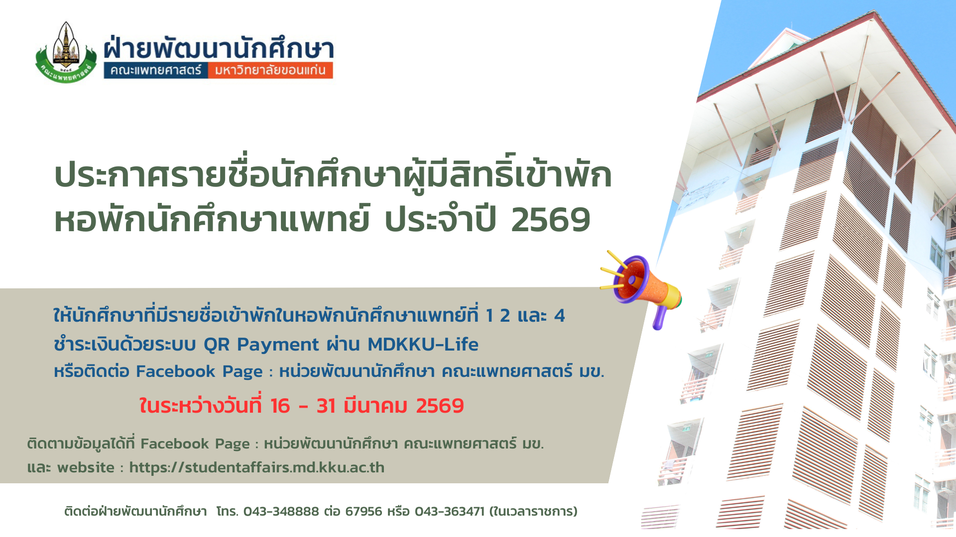 ประกาศรายชื่อผู้มีสิทธิ์เข้าพักในหอพักนักศึกษาแพทย์ที่ 1 2 และ 4 ประจำปี 2569