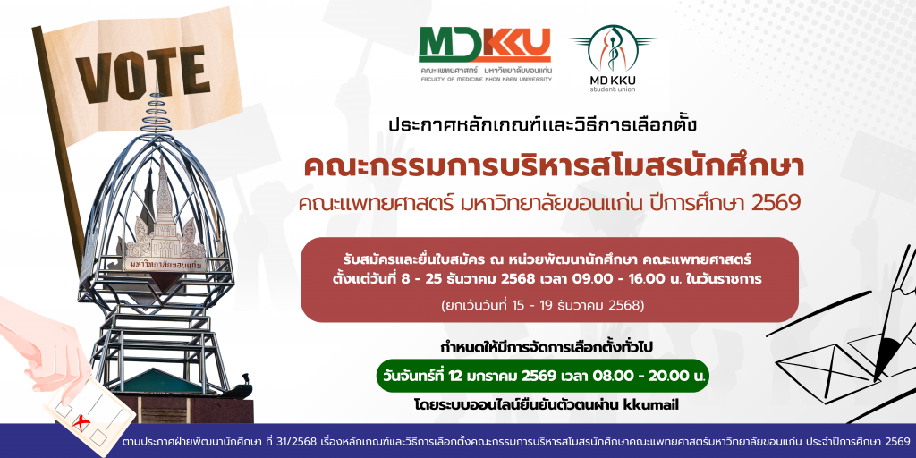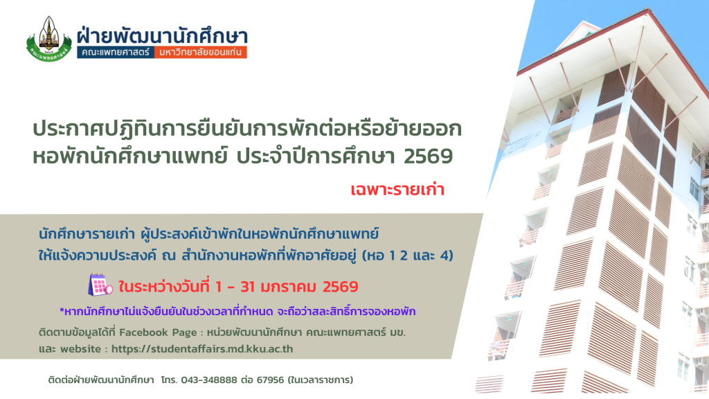 ประกาศปฏิทินการยืนยันการพักต่อหรือย้ายออกของนักศึกษา หอพักนักศึกษาแพทย์ประจำปีการศึกษา 2569 นักศึกษารายเก่าแจ้งความประสงค์เข้าพัก ในระหว่างวันที่ 1 – 31 มกราคม 2569 ณ สำนักงานหอพักที่อาศัยอยู่ (หอ 1 2 และ 4) หากไม่ยืนยันตามระยะเวลาที่กำหนดจะถือว่าสละสิทธิ์ในการจองหอพักและจัดสรรห้องพักให้กับผู้ที่สนใจต่อไป ประกาศเพิ่มเติม https://kku.world/606mrq